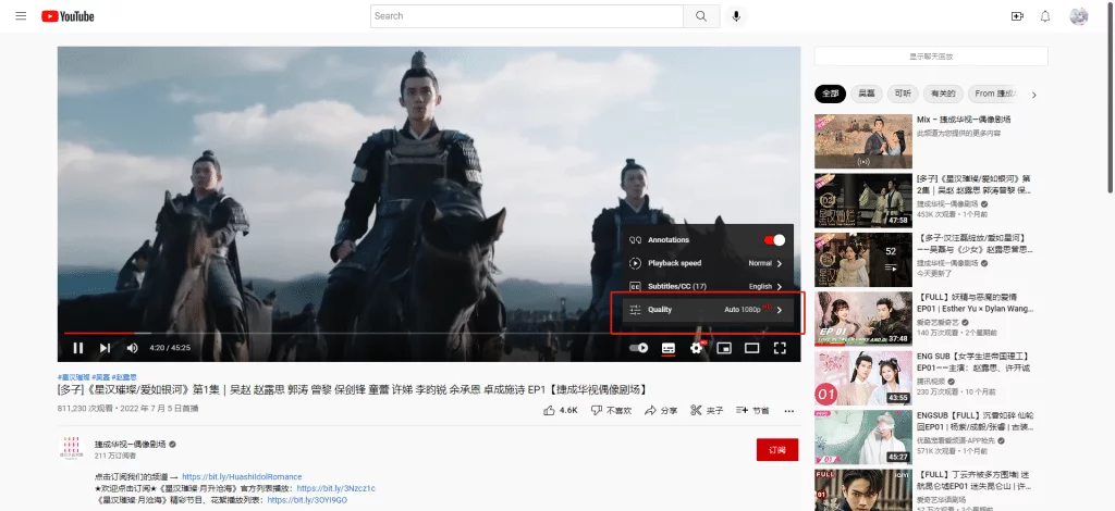 同样的,在电脑端我们也进行了测试,连接了加速器之后进入 YouTube 官网,播放了一个长视频,系统自动匹配的画质完全可以达到 1080P,观看体验非常顺畅。